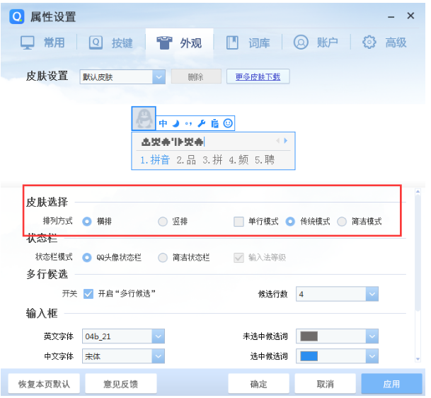 2、在属性设置界面打开“外观”分类,找到“皮肤选择”,在皮肤选择里有一个“单行模式”,将它取消就可以在打字时显示拼音了。