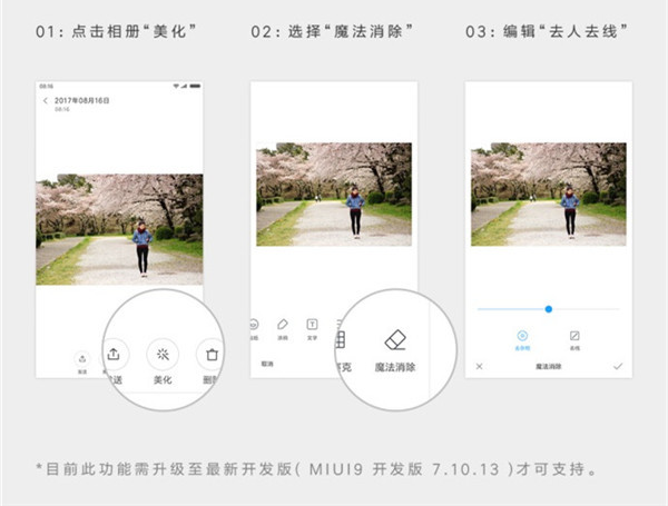 今日,小米官方宣布MIUI 9开发版中上线了魔法消除功能,可对照片中的杂物、杂线进行快速抹除,用户无需任何修图经验。那么MIUI9魔法消除功能怎么使用呢?下面快和小编一起来看看它的使用方法和效果展示吧。
