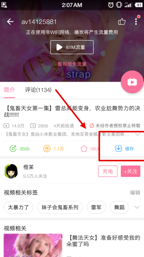 3、点击进入任意一个视频,进入之后发现下面的【缓存】。