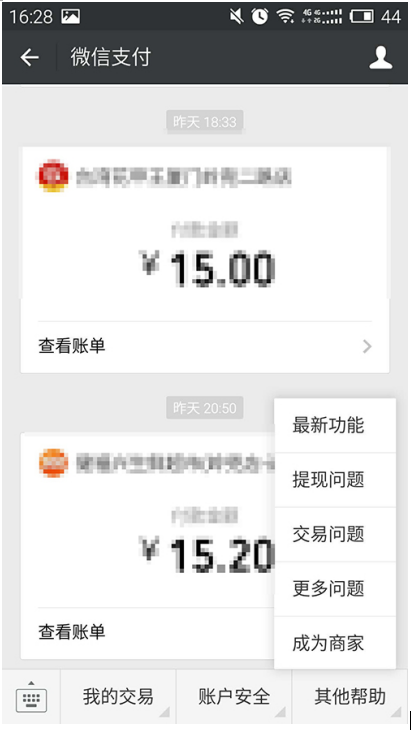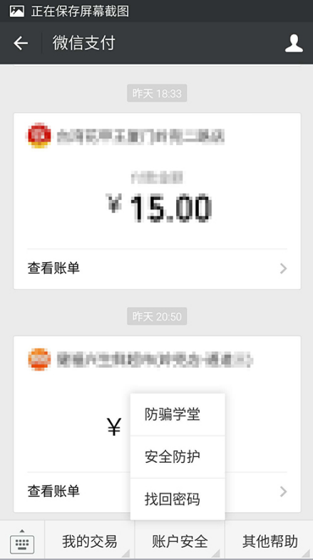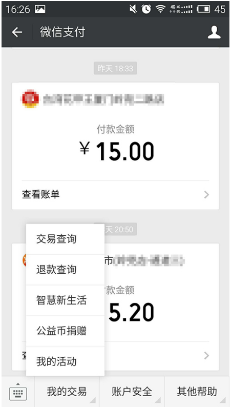 打开微信,搜索请关注“微信支付”公众号,微信支付公众号中提供了3个菜单,分别是我的交易、账户安全、其他帮助,如图所示;
