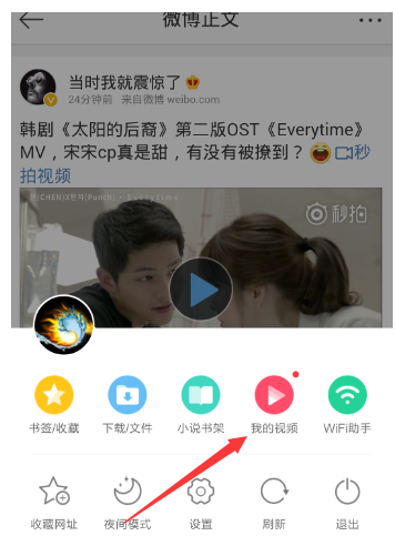 1、我们在UC浏览器中打开新浪微博,点击需要下载的视频,然后可以看到播放视频页面有如图所示的一个小箭头,这个就是下载图标了,点击即可下载;