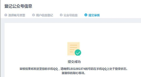 第七步,这时个会提示提交成功了,而且成功通过后会发到你的手机QQ上。