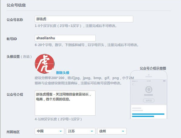 第五步,填写公众号名称、ID、头像、介绍和地区;