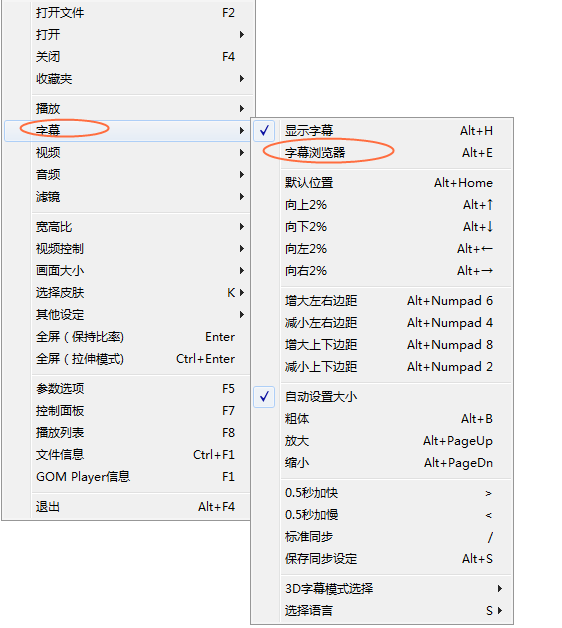 2、接着用快捷键“Alt+E”打开“字幕浏览器”,或者在视频界面点击鼠标右键,在弹出的选项中点击“字幕”—“字幕浏览器”;