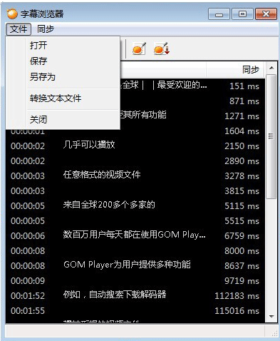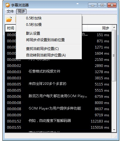 3、在“字幕浏览器”窗口点击“文件”—“打开”,将我们之前下载的字幕添加进来,添加完毕后在“同步”中调整字幕位置,设置完毕后将其关闭就可以了。