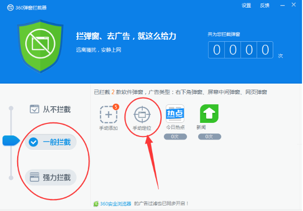 2、在“弹窗拦截”中我们可以选择“一般拦截”或者是“强力拦截”,选择好后点击“手动定位”;