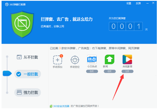 4、之后你会在360杀毒的弹窗拦截中发现多出来一个“央视影音”,这就说明该弹窗已经被拦截掉了。