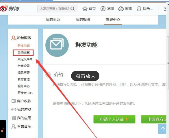 3、在管理中心,点击粉丝服务选项下面的自动回复选项,