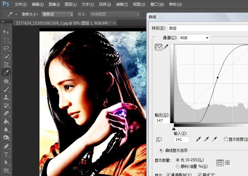 7、调整曲线,一边调整一边观察图片的变化。