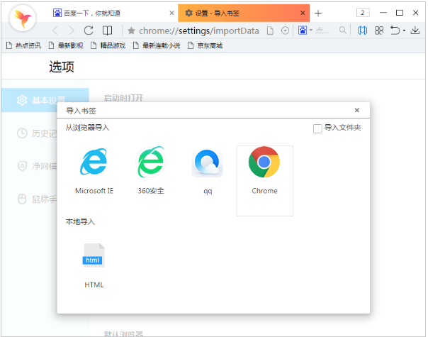 从浏览器导入的话,只需选中对应的浏览器就会把该浏览器的收藏夹导入到净网大师浏览器中了;本地导入的话则是导入HTML文件;