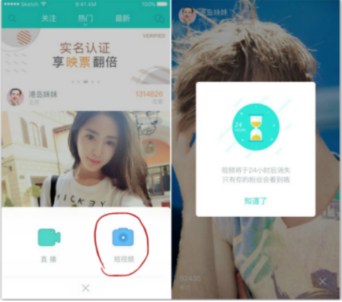 映客的短视频功能有一个有趣的地方,就是“24小时制度”。主播可以拍好10秒以内的短视频,发到自己的个人主页上,其他人可以在“请关注”页面即时看到主播的动态。所有映客用户每天最多可上传100条短视频,24小时之后就会消失。当然,如果观众觉得这条短视频内容有价值的话,可以将其下载下来,不过一定要在24小时之内。