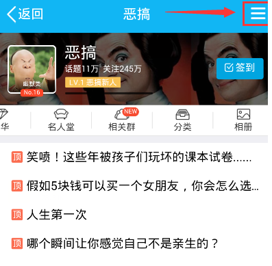 2、选择想要取消请关注的兴趣部落,打开它进入到该部落的首页,然后点击右上角的菜单就可以看到取消请关注的选项了。