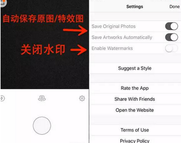 打开Prisma,为了不留遗憾,我们先对软件进行设置,开启保存原图or效果图(这样只要有套上滤镜的作品可以被自动保存下来),关闭水印(看个人喜好)。