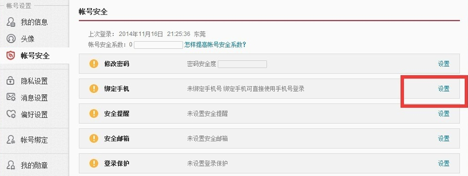 4、在帐号安全设置页面,我们点击打开“绑定手机”后面的“设置”。