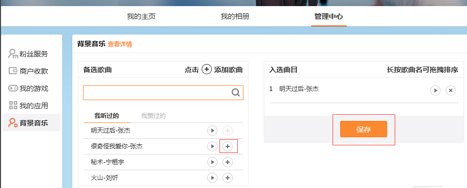 6、除了上述的方式,你也可以在点击“个人主页”中的“管理中心”,选择其中的“背景音乐”选项,