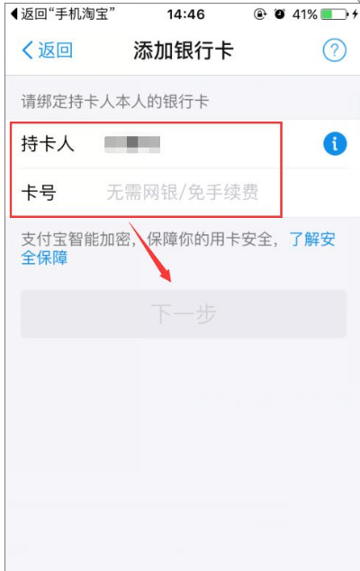 7、根据提示填写“持卡人”和“卡号” ,点击“下一步”,根据提示完成绑定。
