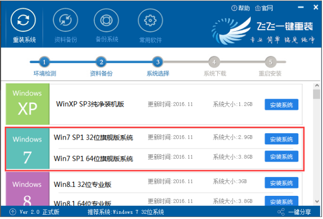 3、到达系统选择界面,飞飞一键重装精选了好用的操作系统,选择自己需要安装的操作系统版本、位数,点【安装系统】;