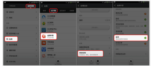 先点击进入【设置】,进入全部【应用】,找到【全民K歌】应用,滚动到最底部,点击进入【权限管理】,最后一步!找到【录音】选项,并勾选上。