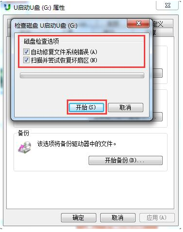 3、在弹出的检查磁盘窗口中将“自动修复文件系统错误”和“扫描并尝试恢复坏扇区”前选项都勾选,然后点击“开始”进行扫描,如图:
