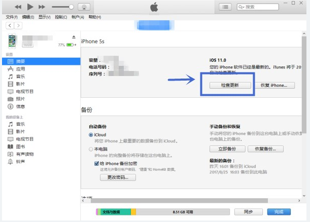 3、在进入之后的界面,我们可以看到【检查更新】按钮。然后在按住Shift键(适用于Windows)或Alt/Option键(适用于Mac)的同时,点击【检查更新】按钮。随后就会弹出文件选择界面,选择事先下载好的IPSW文件也就是iOS固件。