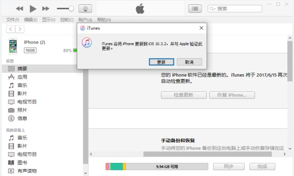 4、iTunes会弹出一个提示框,提示你的iPhone将会更新到下载的固件版本,点击【更新】,稍作等待在手机上输入口令,最后等待更新完成即可。