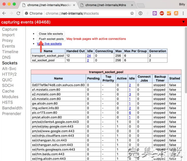 5、点击「Flush pocket pools」按钮以清除 Chrome 的 socket 池。