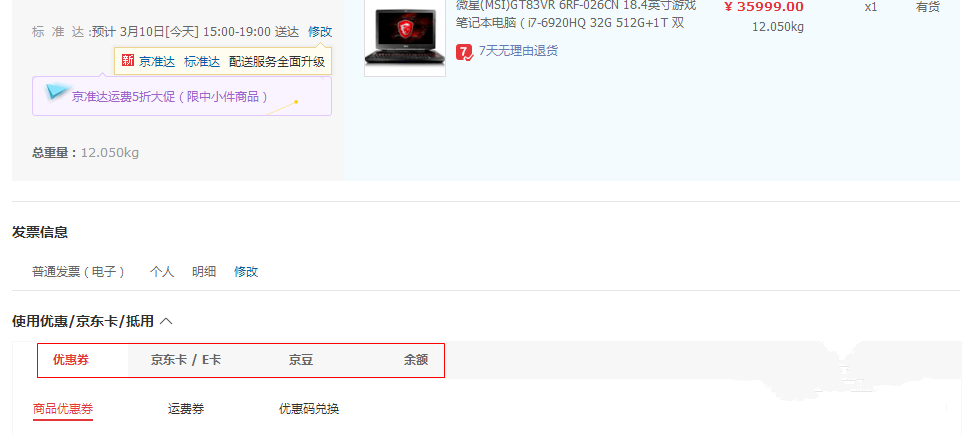 4、提交订单前,可以在提交订单的页面选择账户余额、京东优惠券、京豆、京东卡/京东E卡组合支付,部分优惠券不支持组合支付,请以实际可勾选情况为准(若无可使用优惠,可直接提交订单)