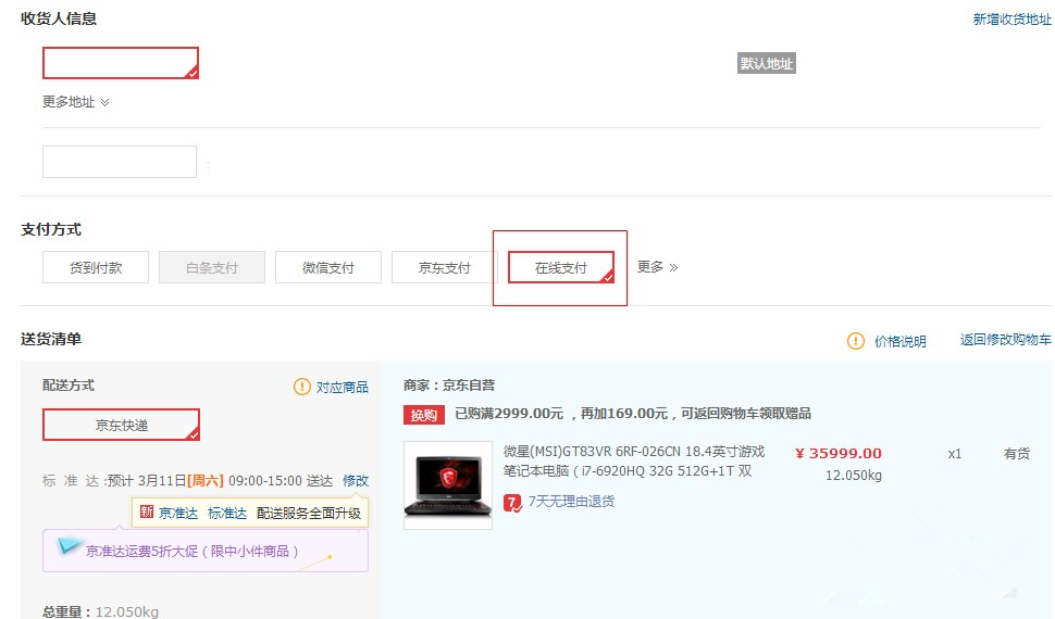 3、确认收货地址、联系方式、发票等信息后,选择【在线支付】,