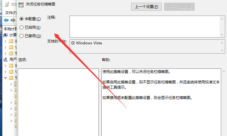 5、在“关闭任务栏缩略图”对话框中,将其设置更改为“未配置”选项,然后在点击“应用-->确定”按钮退出即可。如图所示;