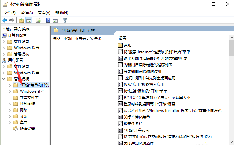 3、在本地组策略编辑器窗口的左侧小窗口中,依次展开“用户配置-->管理模版-->开始菜单和任务栏”选项。如图所示;