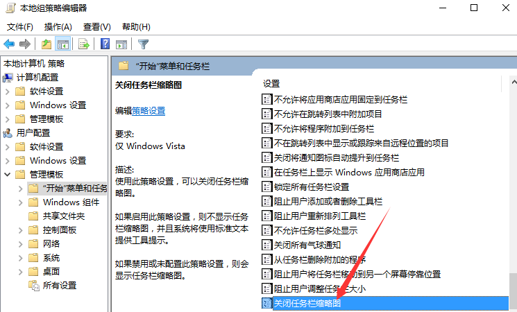 4、在“开始菜单和任务栏”选项右侧窗口,找到“关闭任务栏缩略图”选项选中并双击鼠标左键将其打开。如图所示;