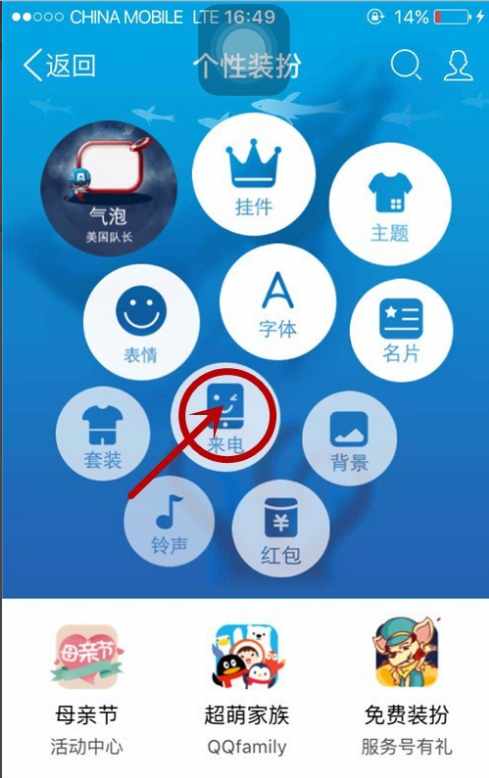 3、在“个性装扮”界面中点击打开“来电”,如图,