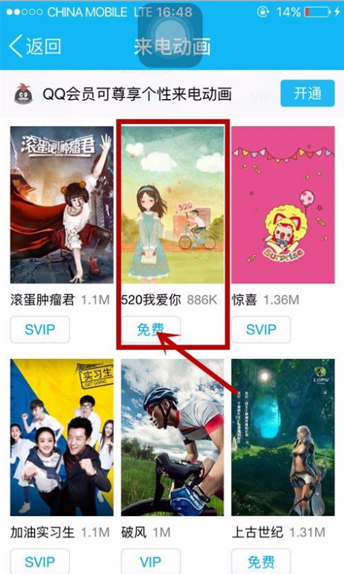 4、在“来电动漫”界面中选择一款自己想要的装扮,点击“免费”,如图,