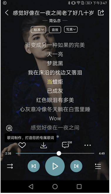 虾米音乐的音乐播放器界面并没有像其他app一样采用光盘式专辑封面,而是使用的海报模式,同时歌词与海报点击屏幕就能互相切换,简单方便,不过没有音质切换功能,比较影响用户体验。