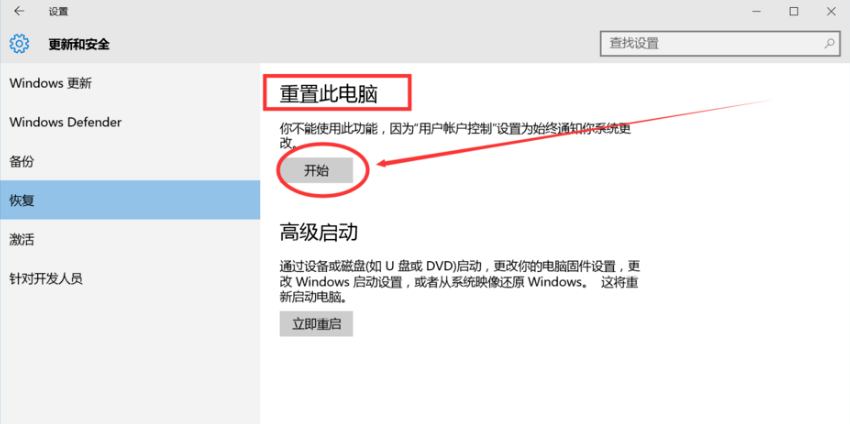 4、进入恢复页面后,即可看到“重置此电脑”,点击开始即可。注意:必须更改”用户账户控制“,如果是始终通知,将不能进行此操作。