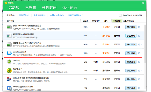 2、在启动项中找到天天看高清影视,并将其禁止开机自动启动就可以了。