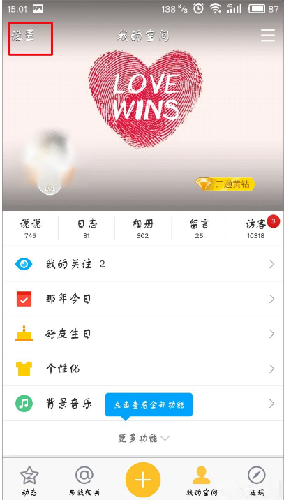 1、打开手机QQ空间,点击最下面的“我的空间”,然后点击最上面的“设置”按钮,