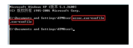 在命令提示符界面输入“assoc.exe=exefile”命令并按回车键即可恢复exe文件的关联。