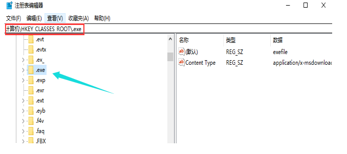 2、打开注册表编辑器界面,在左侧的注册表树依次展开到以下分支,HKEY_CLASSES_ROOT\\.exe