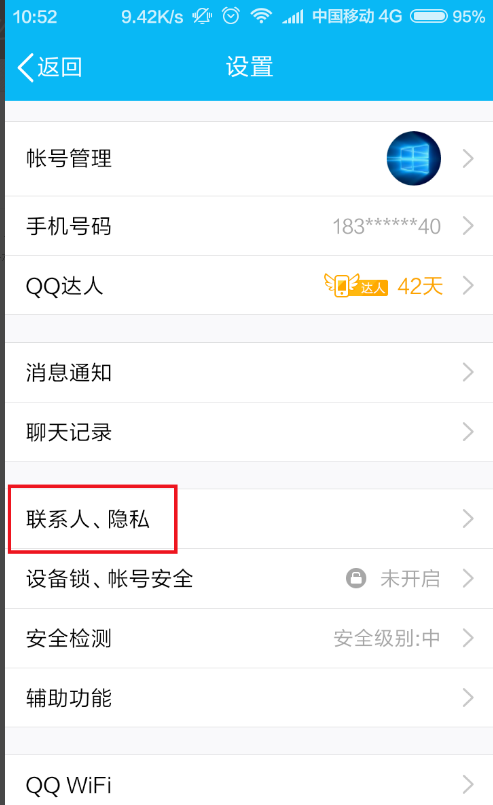 2、进入手机QQ设置页面中,点击选择“联系人、隐私”设置选项,打开相关的设置项目。