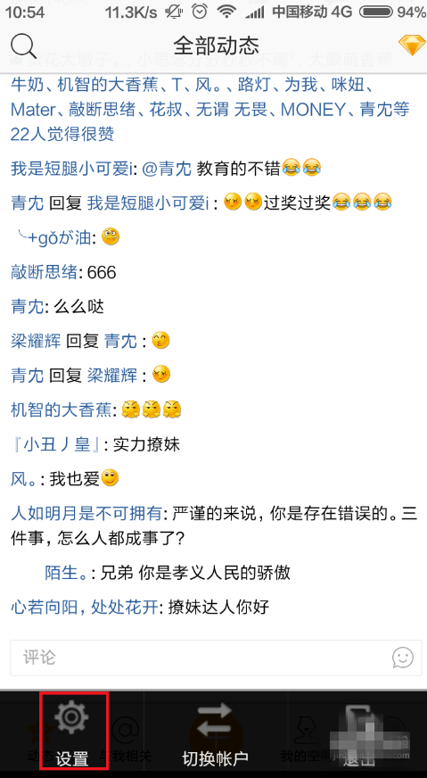 1、在手机QQ空间应用主页面,按下菜单按钮在弹出的页面中选择“设置”选项。