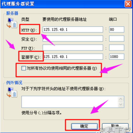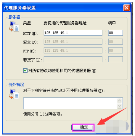 7、在“代理服务器设置”对话框中,取消“对所有协议均使用相同的代理服务器”前面的√。然后,在HTTP方框和套接字对话框之中填上不同的ip地址和端口,如此只要你一链接互联网,就不会显示你真实的ip了。在百度搜索框之中输入“ip”两个字,看看是不是已经变化成你刚刚设置的代理ip了。ok大功告成。