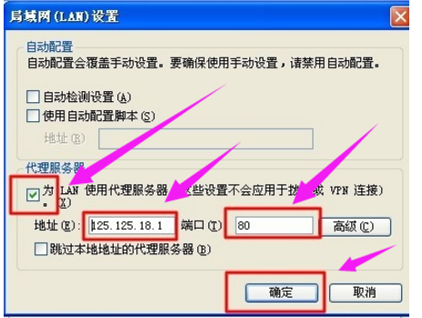 4、在“局域网设置”对话框之中,在“为LAN使用代理服务器(这些设置不会应用于拨号或 vpn链接)”之前打上√。然后在地址和端口这里填写你准备好的信息即可,