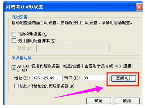 5、经过以上设置之后,基本上可以隐藏自己的ip了,但是我们登陆一些比较高级的网站时或者别人使用比较厉害的软件测试的时候,可能还是能查出我们的ip。所以,为了彻底隐藏我们的ip,还可以同时设置:在“局域网设置”对话框之中,点击“高级”按钮,