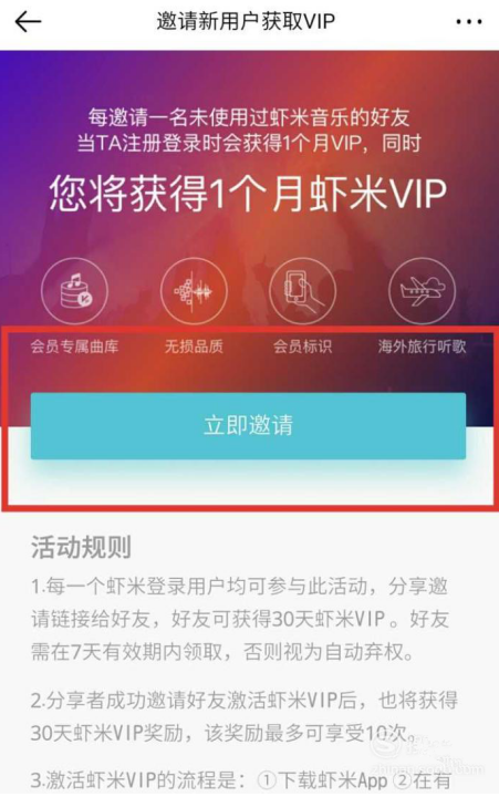4、最后就进入活动页面了,我们只要邀请一个未注册虾米音乐的好友,就可以获得一个月虾米音乐会员哦(如图所示)。