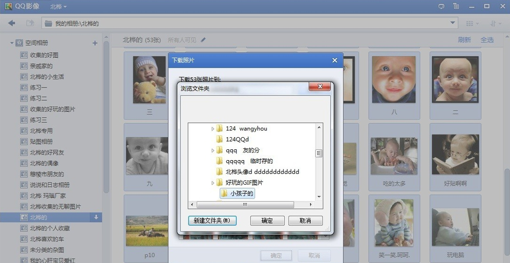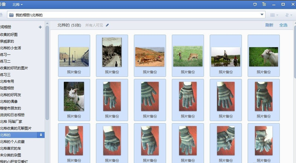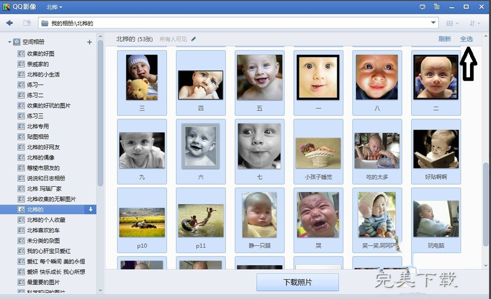 7、再回到QQ影像管理页面,就可以看到所有照片的名称都变成照片备份了,然后再选择全选,然后批量下载,(如果这个时候没有变成新的名称,可以把软件关掉再重打开,就会更新成新的名称了)