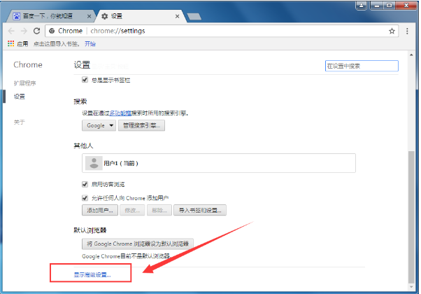 2、来到设置界面后我们将界面滑动到最底端,然后找到“显示高级设置”;
