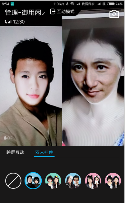 双人挂件其中最有趣的当属“换脸”挂件了,该挂件让用户可以进行换脸操作,在视频聊天的时候将双方的人脸互换,只是换脸,衣着打扮等还是原来的样子,这样来张合照,真是喜感十足。