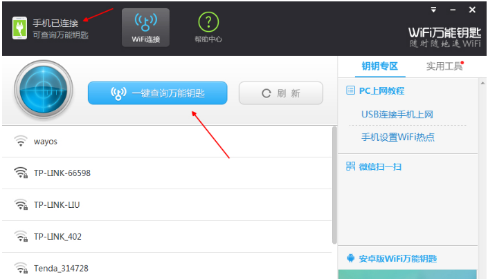 3、启用热点之后,手机先放一边。这时我们注意查看一下,WiFi万能锁匙电脑版的左上角,是否有显示“手机已连接”了!如果有,说明电脑已经成功共享手机的网络了,然后点击“一键查询万能锁匙”按钮。