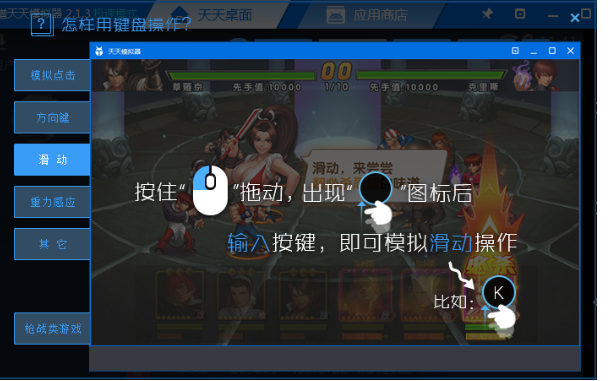 我们在玩手机游戏的时候可能会需要用到滑动按键,比如说向上滑、向下滑是跳跃下降,在手机上我们可以通过手指滑动屏幕来完成,那在天天模拟器中该怎么操作呢?下面小编就给大家介绍设置天天模拟器滑动按键的方法。